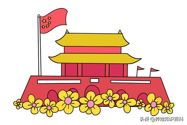 5、最后就是为天安门涂色了,用到的颜色有黄色、红色和粉色。城墙和旗子涂成红色,楼顶和鲜花涂成黄色,花心涂成粉色。涂完,天安门就画好了。