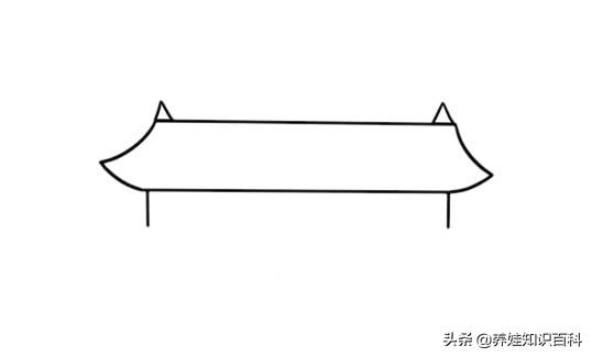 1、先画一个不规则的梯形,代表天安门的城楼顶部。梯形的两端呈上翘状态,有一定的弧度。在顶端画上两个尖角,底部画上两条对称的直线。