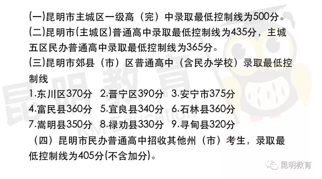 昆明市(主城区)普通高中录取最低控制线为435分,主城五区民办普通高中录取最低控制线为365分。