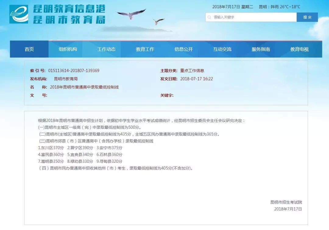 昨天下午,昆明市教育局发布2018年昆明市普通高中录取最低控制线,其中昆明主城区一级高(完)中录取最低控制线为500分。