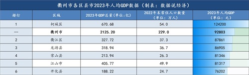 衢江区和龙游县2023年人均GDP分别为8.79万元和8.69万元,在各区县市中排名第二和第三。