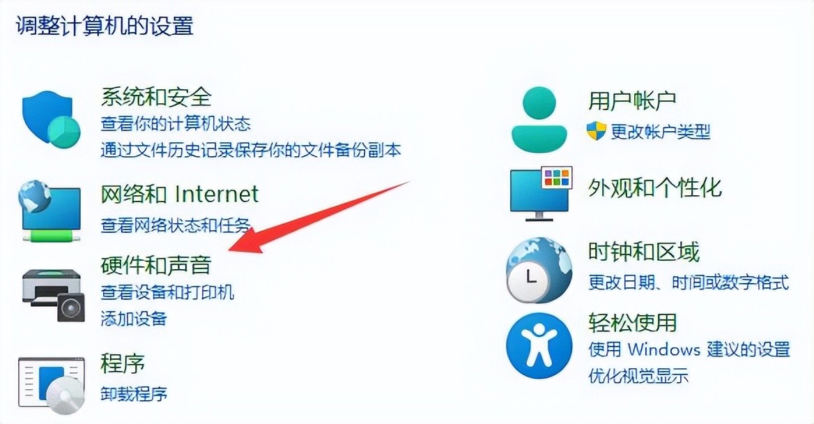 2、接着双击“控制面板”中的“硬件和声音”,进入新页面;