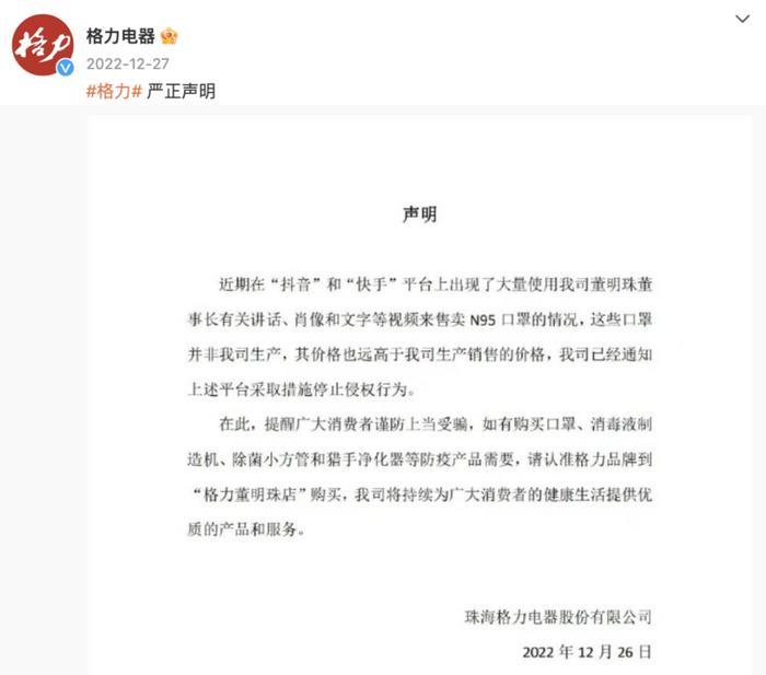 “短视频平台上用董明珠视频售卖的N95口罩,都不是格力生产的。”