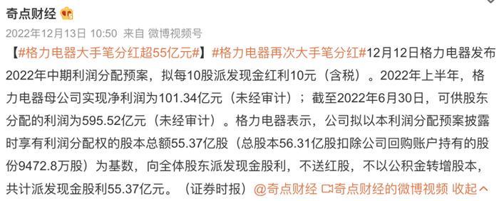 新闻里格力年底再次大手笔分红,直接拿出了55.37亿元现金派发股利。