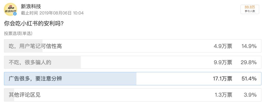在网上的一份投票中,有相当多的网友表示小红书里面的广告内容需要注意分辨: