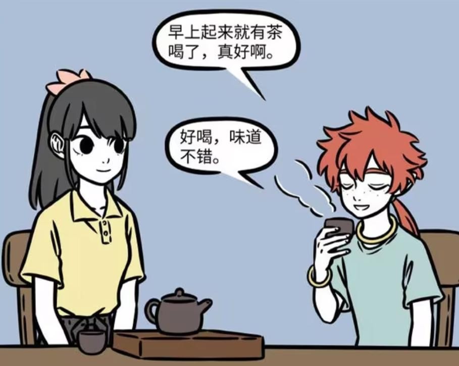 红孩儿比较优雅,喝茶的动作看起来很有范。红孩儿表示,早上起来就有茶喝,那是件很幸福的事情。红孩儿喝过茶之后,表示味道不错,李贞英确实有两把刷子。