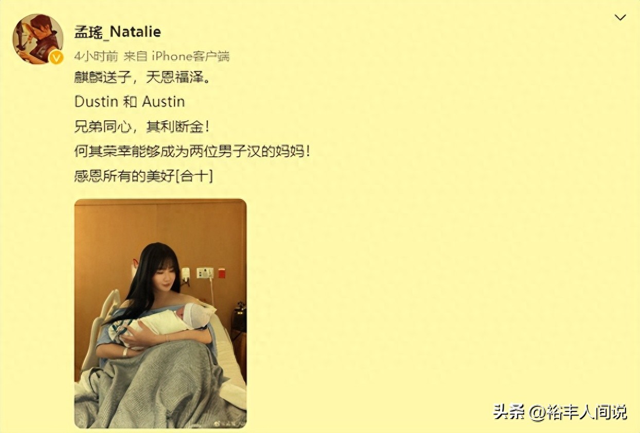 9月15号,“晶女郎”孟瑶突然官宣产下二胎,她在留言处说道:麒麟送子,天恩福泽。Dustin 和 Austin 兄弟同心,其利断金!何其荣幸能够成为两位男子汉的妈妈!感恩所有的美好。
