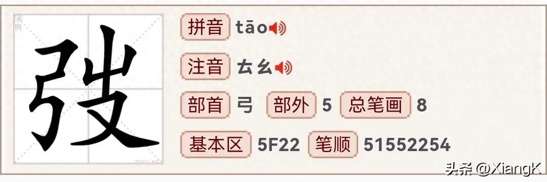 读音:【tāo】、同音字“涛”、部首为弓、总笔画8、结构:左右结构。