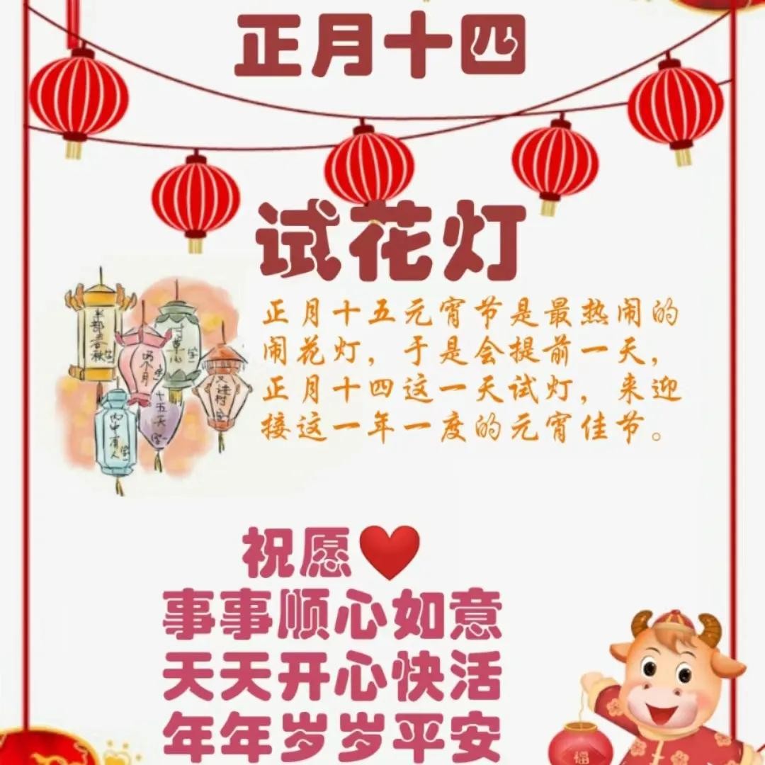 试灯习俗:在古代,正月十四晚上,人们会开始试挂灯笼,即“试灯”。这是因为正月十五是盛大的元宵节,又称“灯节”,家家户户都要挂起五彩斑斓的灯笼、燃放绚丽的烟火来庆祝。试灯的目的在于确保所有灯笼都能在新年之夜璀璨绽放,为节日增添浓厚的喜庆氛围。