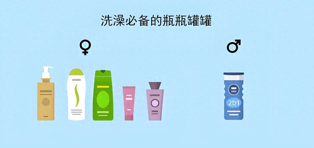 洗漱间的这个现象,相信许多人都有感受吧!大部分男人只有一瓶沐浴露、一瓶洗发水,或者干脆一瓶二合一沐浴洗发露,而女人却不一样,护发素、洗面奶、保湿霜。。。。。等等。