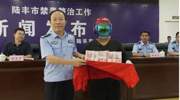 而这位举报有功的群众,头戴摩托车头盔领现金的照片,也成为中国禁毒历史当中的靓丽一面。