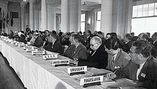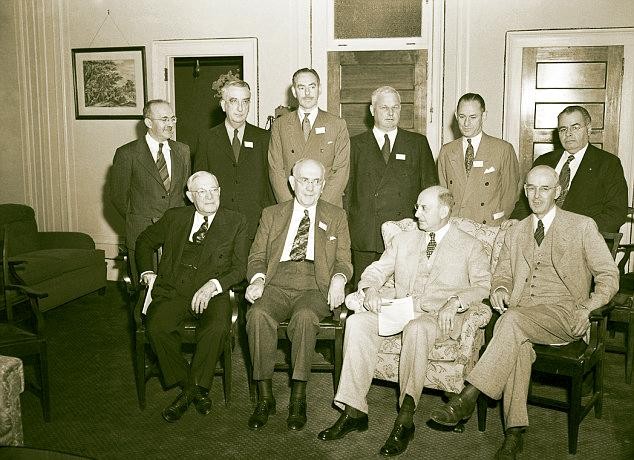 财长摩根索(前排右二),怀特(后排左一),后来的财长文森(后排左二),国务卿艾奇逊(左三)