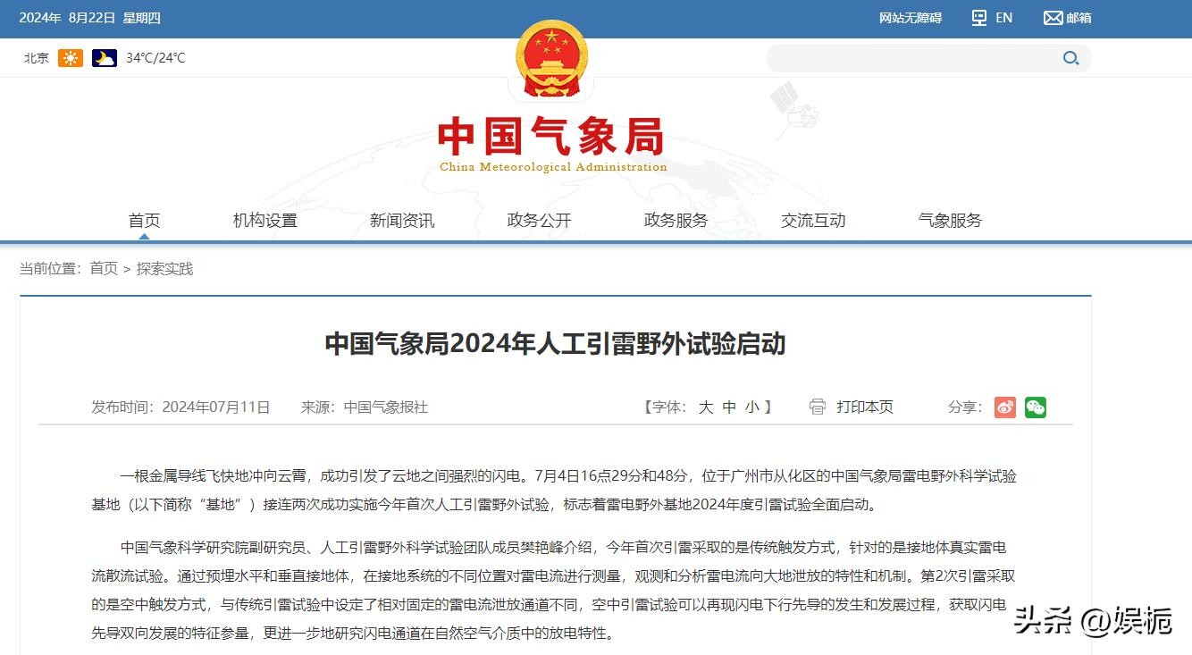 中国气象局于2024年7月11日所发布《中国气象局2024年人工引雷野外试验启动》