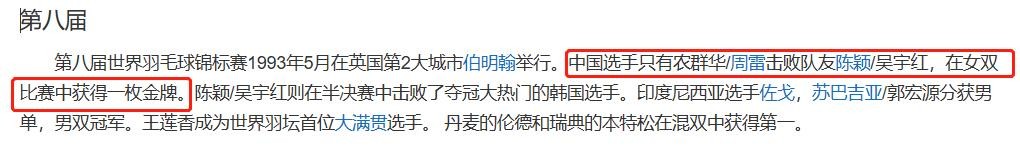 1995年,中国队女双队员葛菲、顾俊击败艾莉莎、泽林,叶某颖战胜王莲香,孙俊战胜阿尔比,中国队一举夺得苏迪曼杯。1996年,亚特兰大奥运会,葛菲、顾俊夺得女双羽毛球金牌。