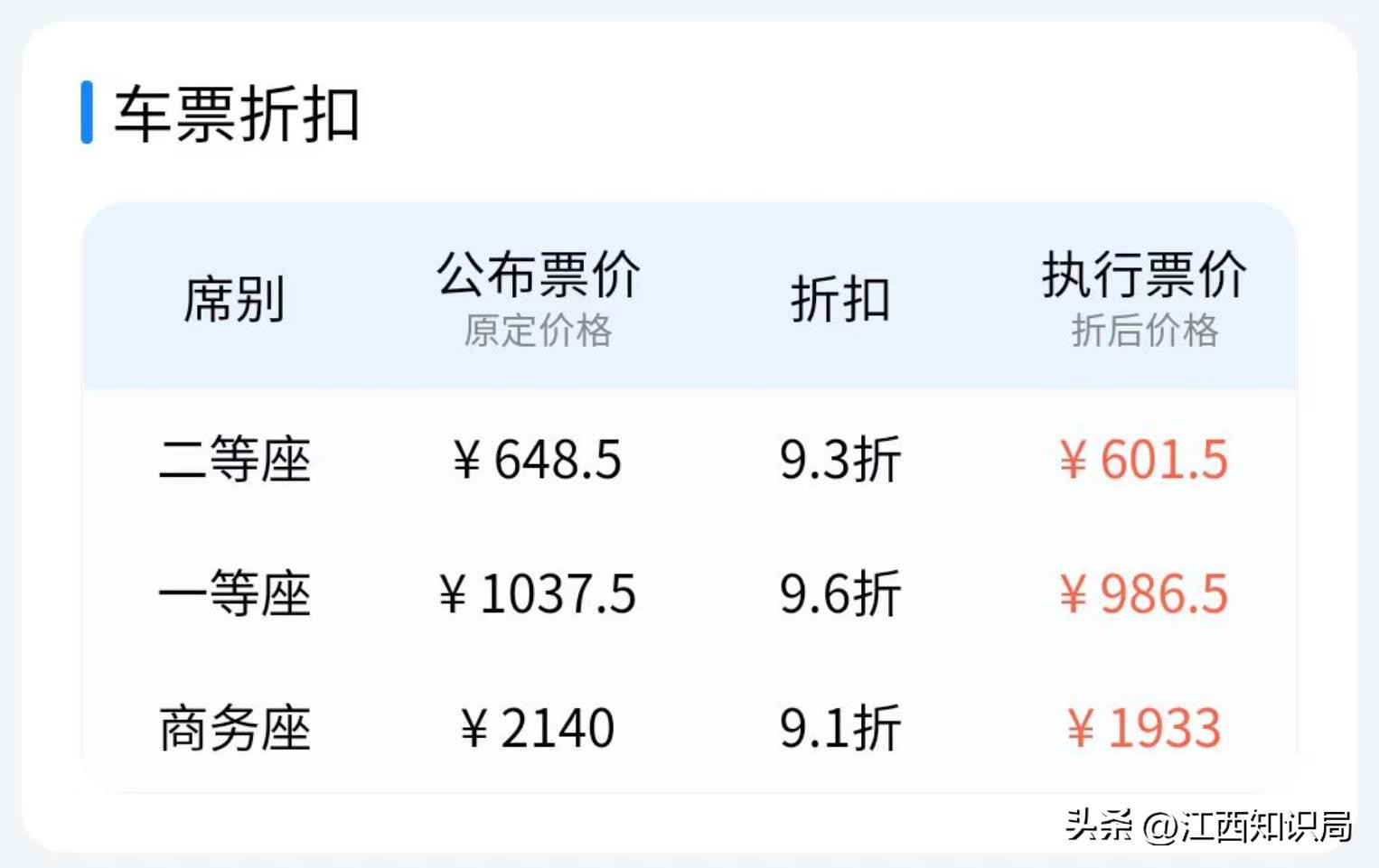 G1810次列车票价信息:目前,全程二等座车票为601.5元(9.3折),一等座车票为986.5元(9.6折),商务座车票为1933元(9.1折)等。