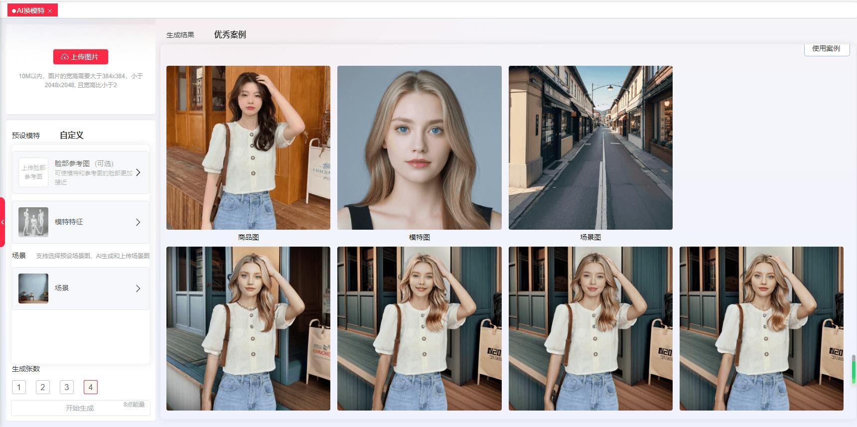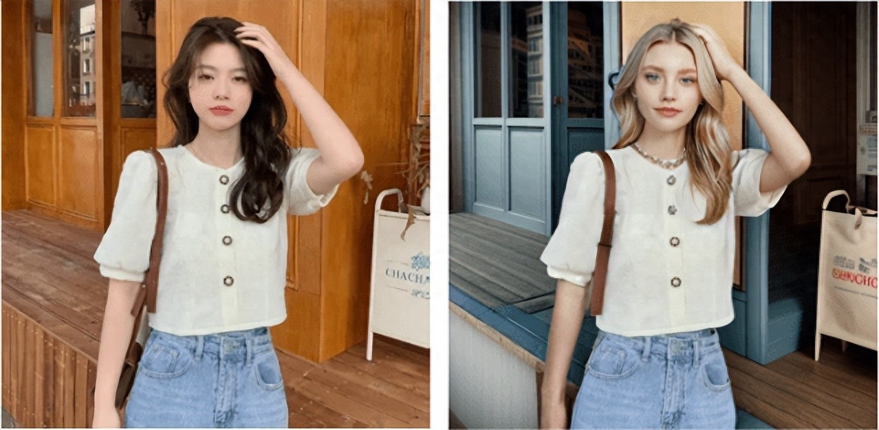 创自由的AI换模功能,可以实现一键换脸,用户只需要上传需要替换的对象图片,然后选择系统内置的模特,选择场景,就可以实现一键换脸的特效,生成全新的AI换脸之后的效果图。