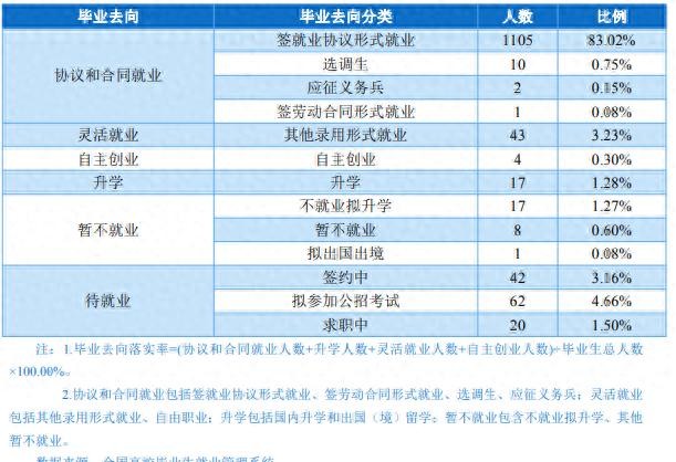 四川警察学院 2020 届毕业生就业率为 85.42%,基本实现充分就业。从具体毕业去向来看,“其他录用形式就业”为毕业生主要去向选择,占比为 68.38%;“签就业协议形式就业”次之,占比为 15.10%。