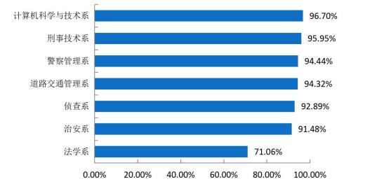 各院系毕业去向落实率 2021 届毕业生分布在 7 个院系,其中毕业去向落实率相对较高的院系为计算机科学与技术系(96.70%)、刑事技术系(95.95%)、警察管理系(94.44%)等。