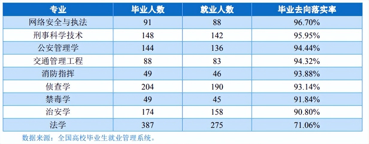 各专业毕业去向落实率2021 届毕业生分布在 9 个专业,其中毕业去向落实率相对较高的专业为网络安全与执法(96.70%)、刑事科学技术(95.95%)、公安管理学(94.44%)等。