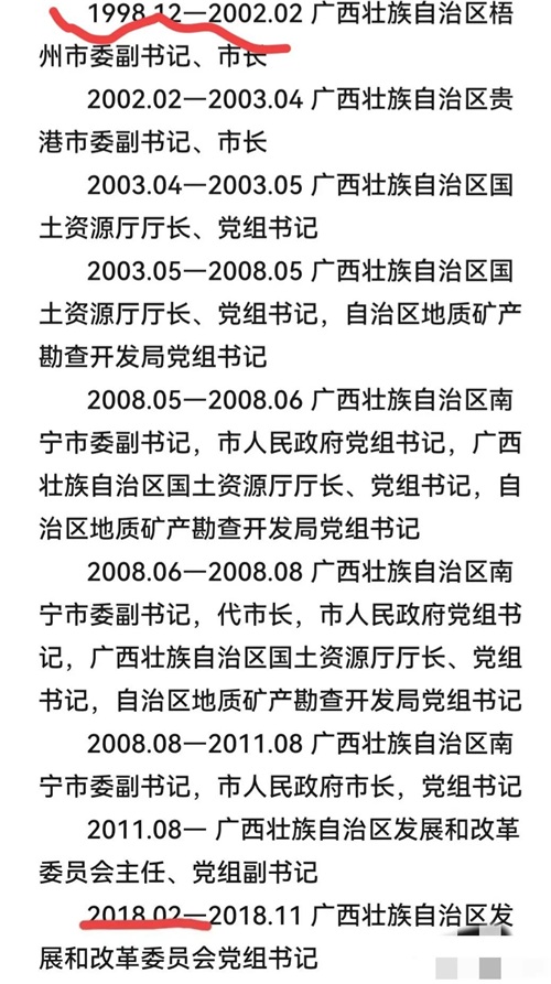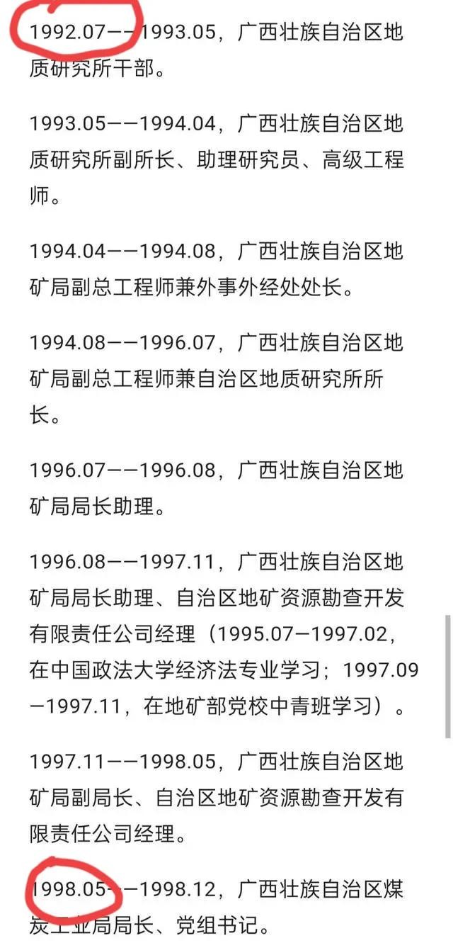从此,他的仕途之路好像搭上了火箭一样,极速上升,1993年被升为地质研究所副所长,1994年就调任广西壮族自治区地矿局副总工程师兼外事外经处处长,四个月以后就升为地质研究所所长。