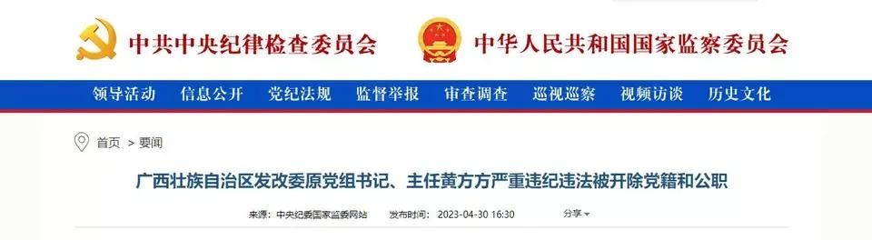 2022年10月27日,广西壮族自治区纪委监委的纪委审查和监委发出通告,宣布广西壮族自治区发改委原党组书记、委员会主任黄方方正在接受调查,时隔六个月后,黄方方被宣布双开,同时,其涉嫌犯罪问题被移送检察机关依法审查起诉,所涉财物也一并随案移送。
