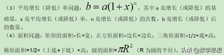 (1)数字问题:①两位数可表示为十位数字×10+个位数字;②三位数可表示为百位数×100+十位数字×10+个位数字;③三个连续整数可表示为x-1,x,x+1;④三个连续奇数可表示为2x-1,2x+1,2x+3;⑤三个连续偶数可表示为2x-2,2x,2x+2。