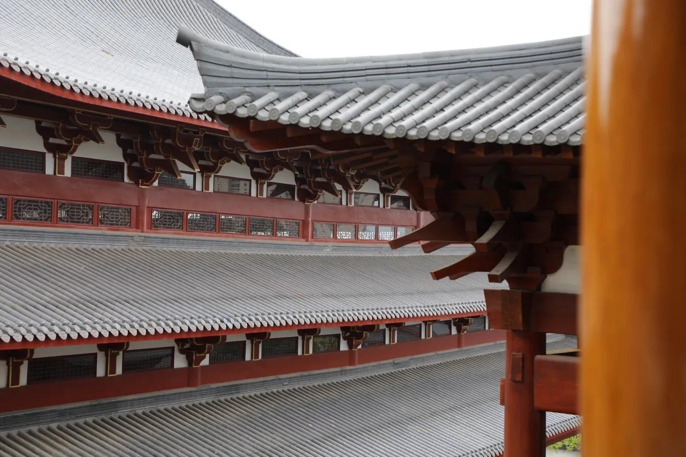 初到寺庙门口,就被壮阔的景致吸引了注意力,灰瓦红墙的庙宇四平八稳地呈现在眼前。