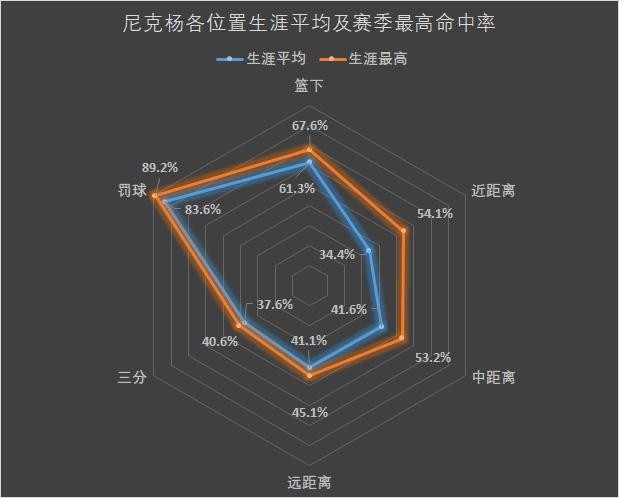 上图是尼克杨各位置的生涯平均命中率和单赛季最高命中率,可以看到,尼克杨除了近距离的两分球以外,在其他位置都有着比较优秀的命中率,在进攻的全面性以及命中率方面,已经做得相当优秀,可以说是联盟一流的得分手也不为过。