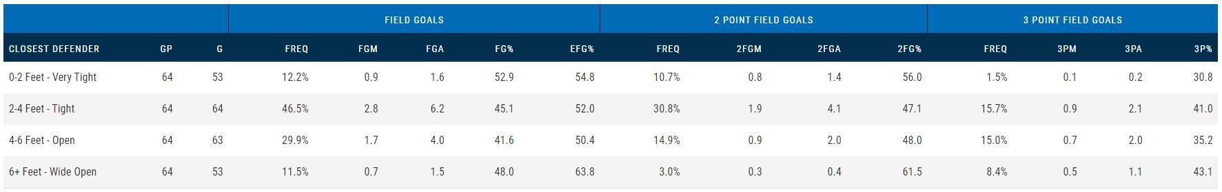上图是尼克杨13-14赛季面对不同防守情况时的投篮情况。可以看到,尼克杨面对贴身防守(防守球员距离0-2英尺)时的出手占比为12.2%,命中率高达52.9%,面对紧迫防守(防守球员距离2-4英尺)时的出手占比高达46.5%,投篮命中率同样为不错的45.1%,并且面对紧迫防守时的三分命中率高达41%。这两项加起来,尼克杨有58.7%的投篮是在对方紧迫防守下强行投出的,但是还有着如此优秀的命中率。可以说面对防守投篮对于尼克杨来说就如同家常便饭,是再普通不过的事情了。