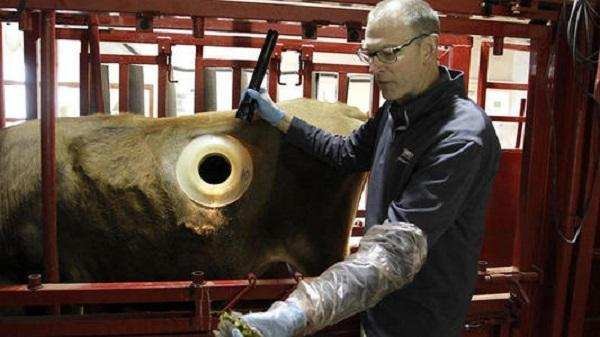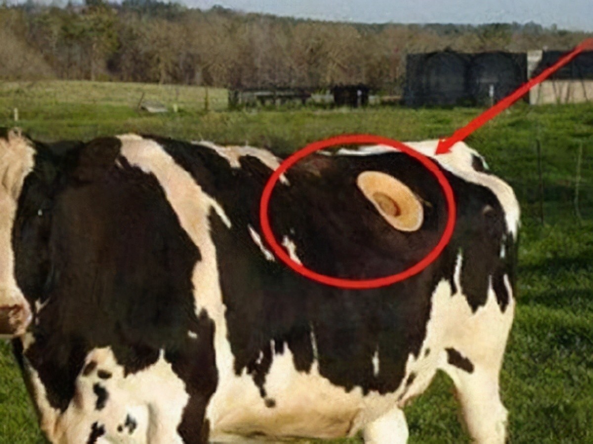 不过,他们最终还是找到了解决食物卡在食道里的方法。牛场主把奶牛的身上靠近胃的地方开一个洞,周围用硅胶封住,洞口安装一块透明的玻璃,这样奶牛胃部的情况就能透过玻璃看的一清二楚。而当奶牛一旦有食物卡住的情况,挤奶工就能打开玻璃,把手伸进洞里去帮它疏通。这就是奶牛身上开洞的原因之一。