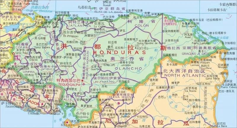 洪都拉斯是位于中美洲北部的一个国家。它北临加勒比海,南濒太平洋的丰塞卡湾,东、南同尼加拉瓜和萨尔瓦多交界,西与危地马拉接壤。是中美洲的第二大国。北部的加勒比海岸长达700公里,西起莫塔瓜河河口,东至格拉西亚斯-阿迪奥斯角的科科河河口。东南方与尼加拉瓜的陆上边界长达922公里,该边界首先从科科河口开始沿科科河向西南方向发展,然后穿过山区到达太平洋的丰塞卡湾