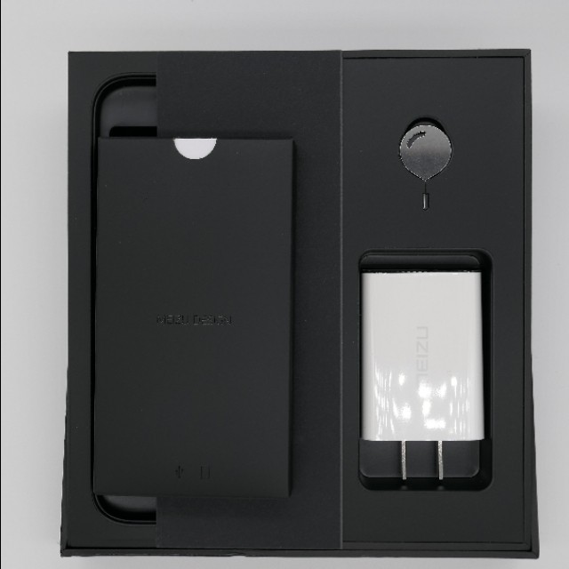 掀开右侧的黑色盖板,可以看到充电器和sim卡卡针。卡针的设计也突显了魅族小而美的风格。有点失望的是并没有随机赠送手机壳和贴膜。