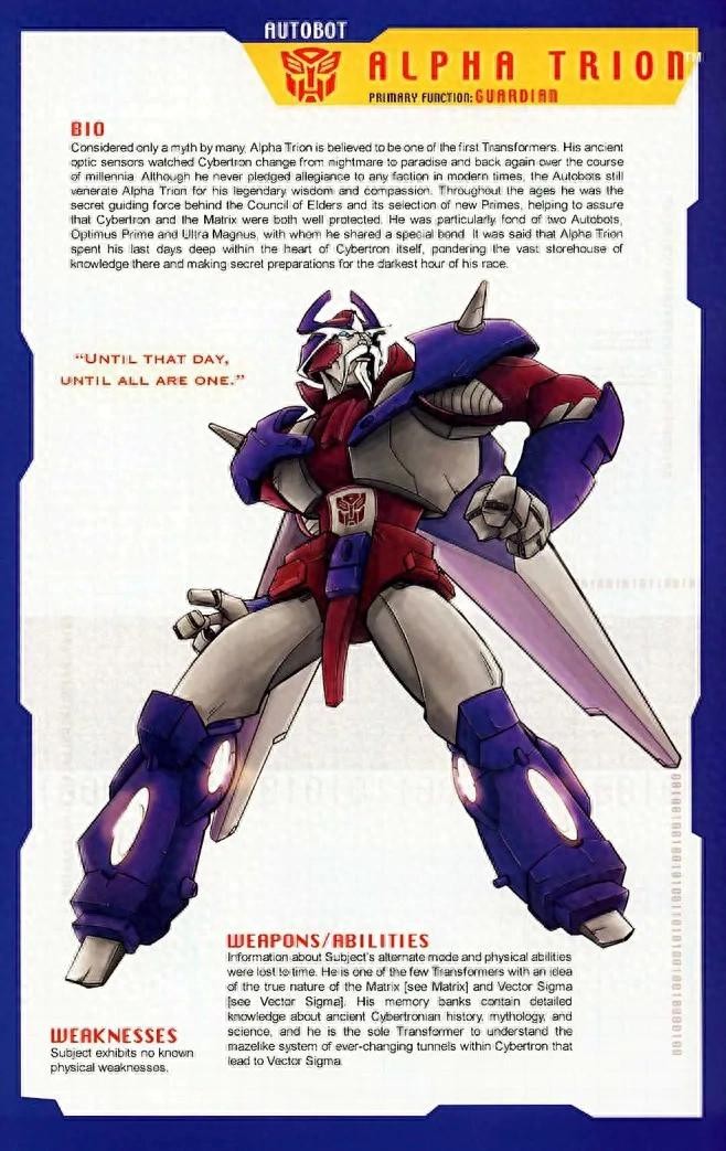 性格坚韧,博学多识的钛师父是塞伯坦上的圣贤,是汽车人中的最智慧的长者。他和塞伯坦内部的魔力神球有着千丝万缕的联系,这使得霸天虎也要敬他三分,年轻时代的钛师父谋略过人,那时他叫做“阿尔法3”,是著名的奴隶起义领袖,在反抗五面怪暴政的战斗中,他渐渐成为了赛博坦星球的机器人领袖。他掌握着很多关于塞伯坦的远古文明的秘密。是他发现了至尊太君遗失的魔力神球的钥匙,并将它改造成能被塞伯坦上的机器人首领使用的领导模块,并借此转化成钛师傅。钛师傅是擎天柱的制造者,在这之后的数百万年间,他一直是塞伯坦正义事业的支持者。最终,为了挽救地球和塞伯坦,维护宇宙和平,他燃尽自己的能量,将自己的火种同魔力神球融合。