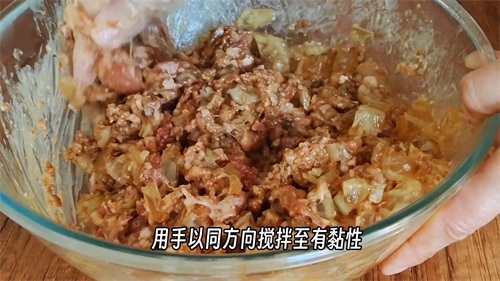 ·炒熟倒入另一半肉末中,加入猪皮冻,用手以同方向搅拌至有黏性,放入冰箱冷藏1小时。
