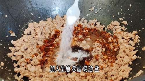 ·猪肉剁成末,油热放一半肉末炒香炒散,加入生抽、老抽、蚝油、盐翻炒上色。
