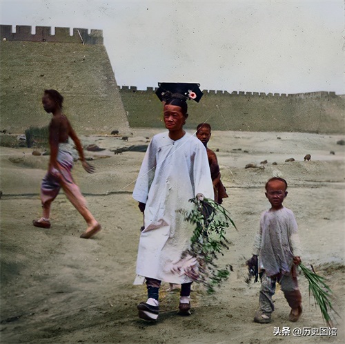 北京城外,一名中年女子,身穿浅色旗袍,头戴大拉翅,脚踩花盆鞋。带着孩子从城墙外大路上走过。仔细看,她的长相与一个名人很相似。