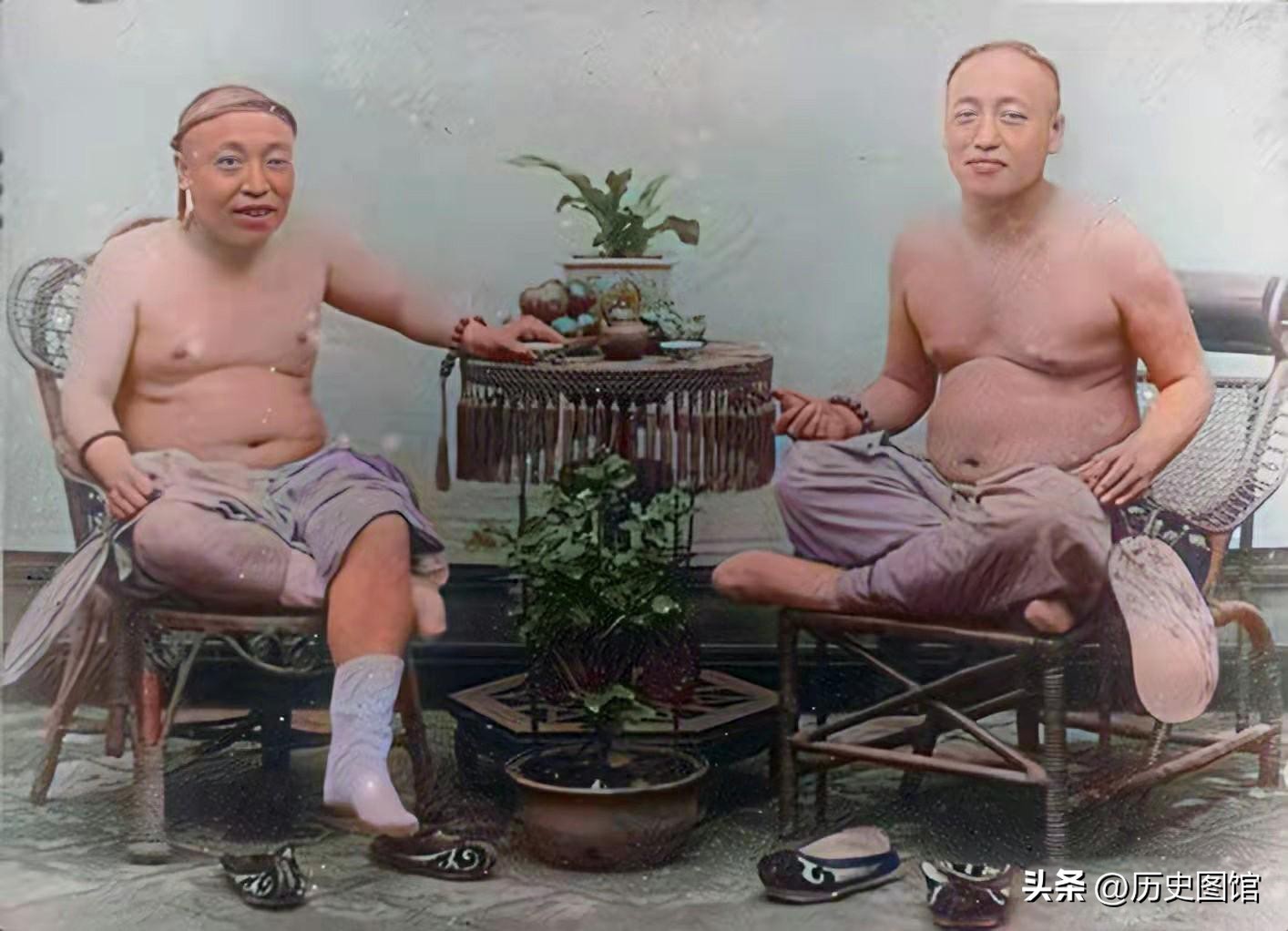 清朝时期,京郊。两名男子光着上半身,坐在院子里纳凉。看两人的气质打扮,不是一般人啊。两人坐在藤椅上,中间有一圆几,放着茶盏和水果,桌布下摆垂着流苏。桌子前特意摆放有一盆鲜花。颇有几分当代小资的情调。