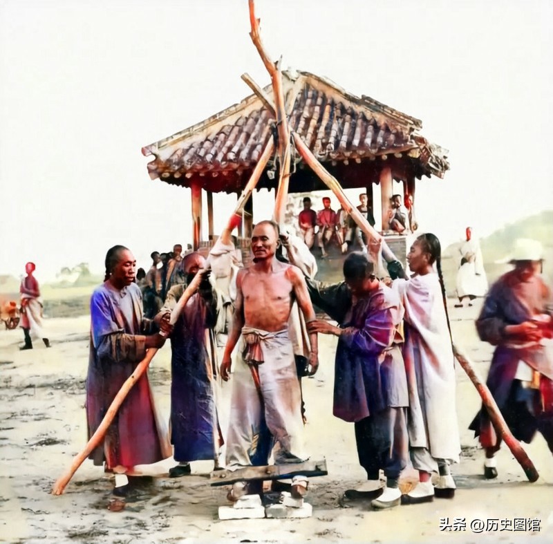 几名刽子手将他绑在几根木棍支起的架子上。而这名土匪却表现得很平静,已经接受了接下来的命运。远处一座凉亭下,坐着不少等热闹的人,他们一点都不害怕。