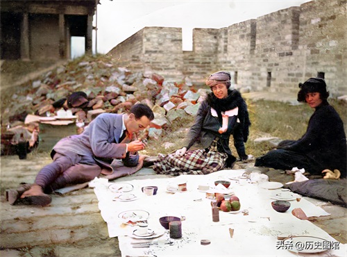 清朝末年,在北京城墙上,一名英国男子和两名女子正在野餐。地上铺着餐布,上面摆放着一些西式美食和水果。