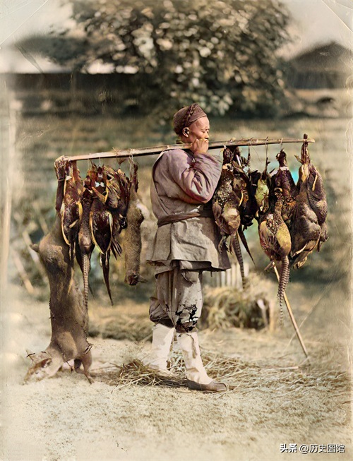 一名猎人用扁担挑着很多野味到集市上去卖。有野山鸡、野鸭、野兔等。个头最大的那个,没看出来是啥动物。