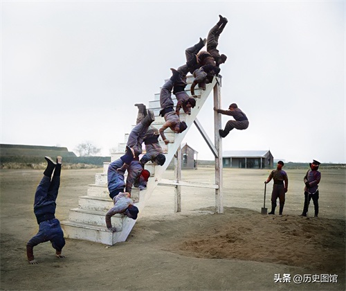 清朝时期,清军士兵正在操场上进行体能训练。他们从立柱上攀爬到台阶顶端,然后身体倒立,撑着双手,一层一层下到地面上。在这个过程中,身体要始终保持倒立。
