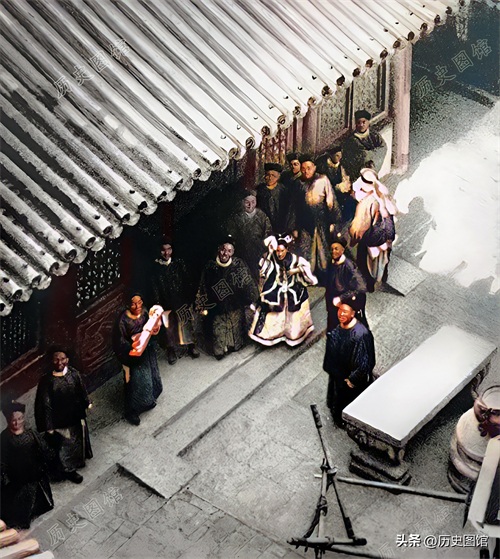 当她走出大殿时,一抬头发现城墙上有几个外国人。慈禧心情很好,并没有生气,还举起手帕朝他们打招呼,引得一众随从都笑了。站在城墙上外国摄影师拍下了这一瞬间。