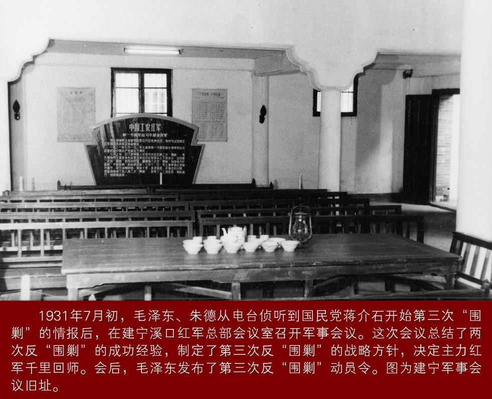 在建宁期间,毛泽东在溪口红军总部召开军事会议,作出“千里回师”赣南的战略决策,并发布第三次反“围剿”动员令。