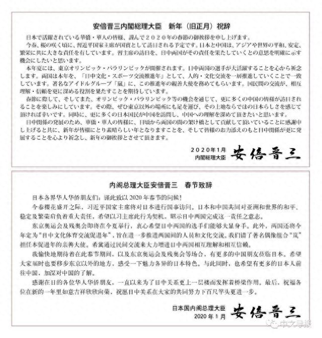 据悉,这是安倍晋三第8次通过《中文导报》发表春节致辞。包括2001年的小泉首相在内,这也是在任日本首相第14次通过《中文导报》向在日华人问候致意。