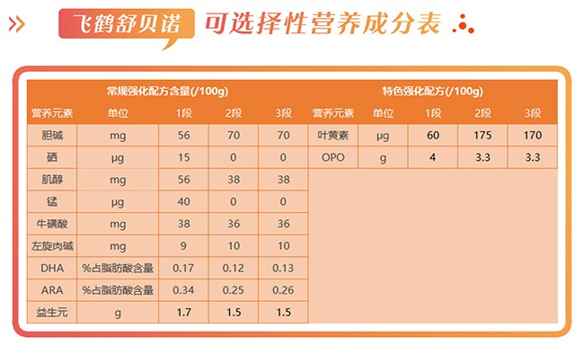 在营养与配方上,舒贝诺添加的基础营养配方严格遵守国家标准,小编在此就不多说,我们具体谈谈大家比较关心的可选择成分。舒贝诺一段添加11个可选择成分,包括9个常规强化配方和2个特色强化配方;二段和三段添加9个可选择成分,包括7个常规强化配方和2个特色强化配方。