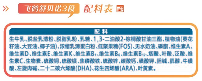 舒贝诺采用位于黑龙江扎龙湿地的自控牧场奶源,属于优质奶源。原料包括:生牛乳和脱盐乳清粉,第一原料采用生牛乳,新鲜程度较好,注册工厂为:飞鹤(镇赉)乳品有限公司,国食注字为:一段:YP20170373;二段:YP20170374;三段:YP20170375。此外,舒贝诺全段未添加白砂糖、麦芽糊精和食用香精等敏感成分,全段添加无水奶油,无水奶油是奶粉中天然乳脂的主要来源,可以促进钙的吸收、软化大便和降低便秘的几率。