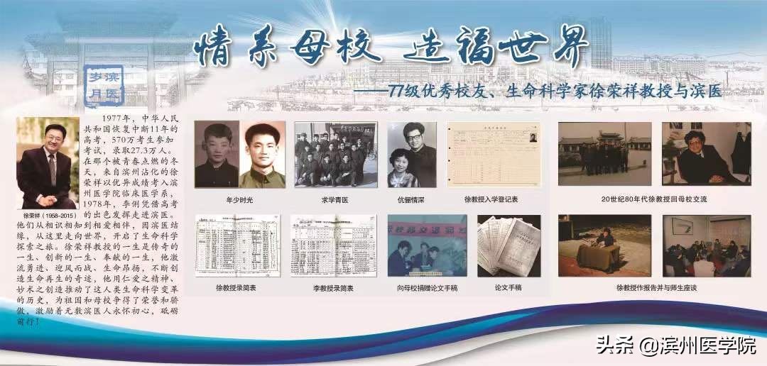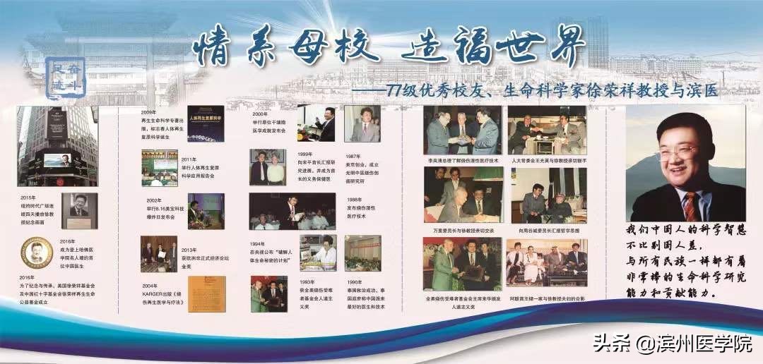 徐荣祥,我校77级校友,美宝集团创始人。在滨医,徐荣祥教授开启了他的医学之路,也是在这里,他开始了革新传统烧伤治疗技术的探索与创新之路,创立了烧伤湿性医疗技术并发展成为系统的烧伤创疡再生医疗技术和人体再生复原科学。主编并出版了系列烧伤再生医学专著及人体再生复原科学专著,获得了数十项国际发明专利,是美国国策"用药物实现损伤器官再生"科学路线专利权所有人,被誉为"人体再生复原科学"之父、"再生生命之父"。