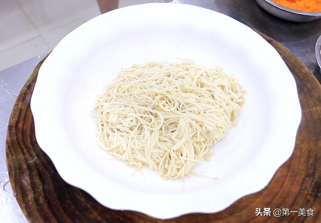 锅内烧水,水烧开以后把金针菇倒入锅中煮1分钟,金针菇煮软以后倒出来,沥干水分放入盘中垫底。
