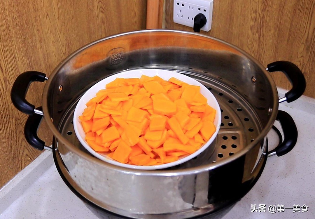南瓜蒸一下再煮,更容易煮出里面的营养,为菜品增色。