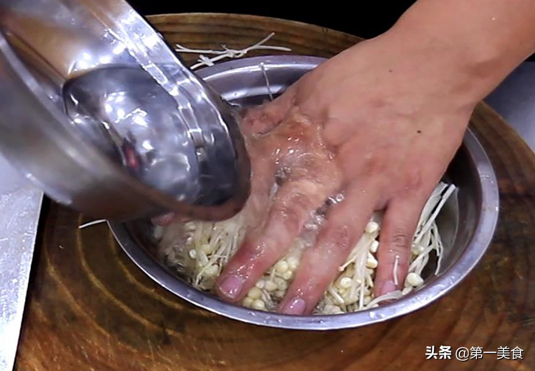 准备金针菇一把,把根切掉,掰成小块,放入清水中浸泡一会儿去除里面的杂质。